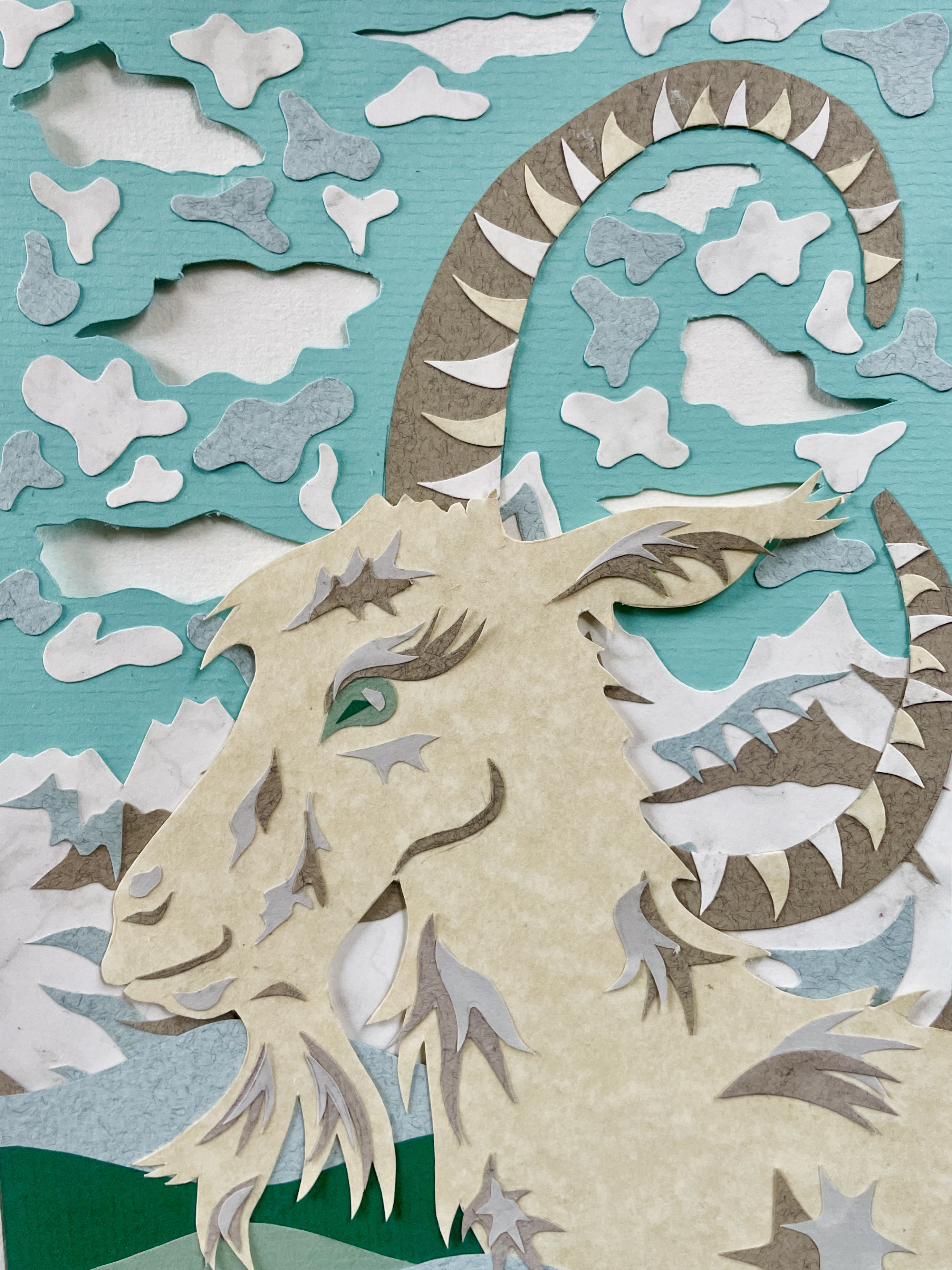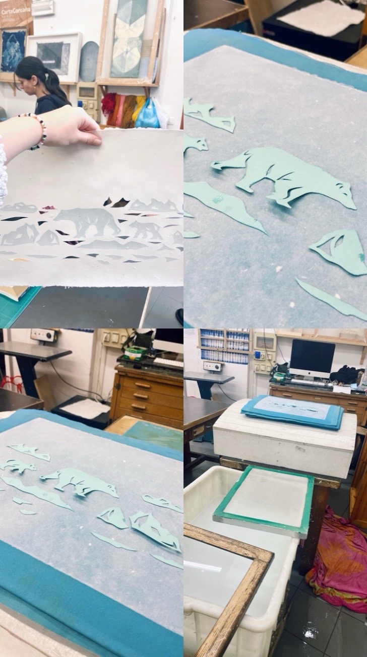 My project was an illustrated book featuring paper cutouts (ritagli di carta) inspired by the Chinese paper cutting tradition (intaglio della carta cinese). Using the Western papermaking technique, I created a piece that told a story about melting ice and environmental degradation. I cut out shapes of icy landscapes and polar bears, placing them between two layers of handmade paper. To add depth and transparency, I incorporated additional cutouts into the composition, creating a three-layered effect. This approach enabled greater interactivity between the pages and visually highlighted the fragility of the environment.