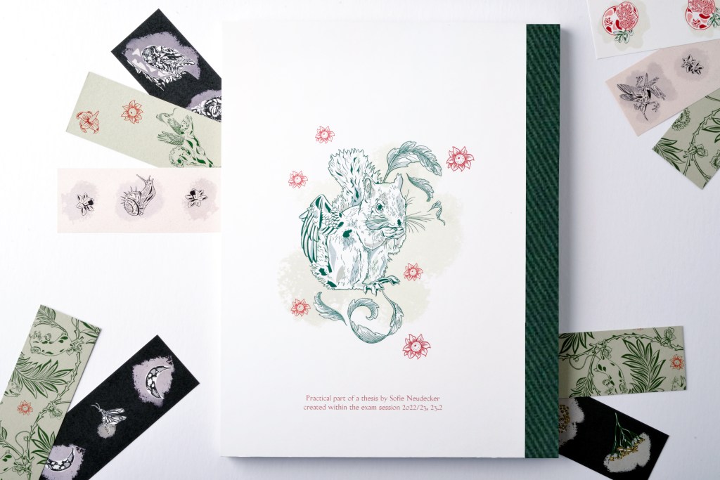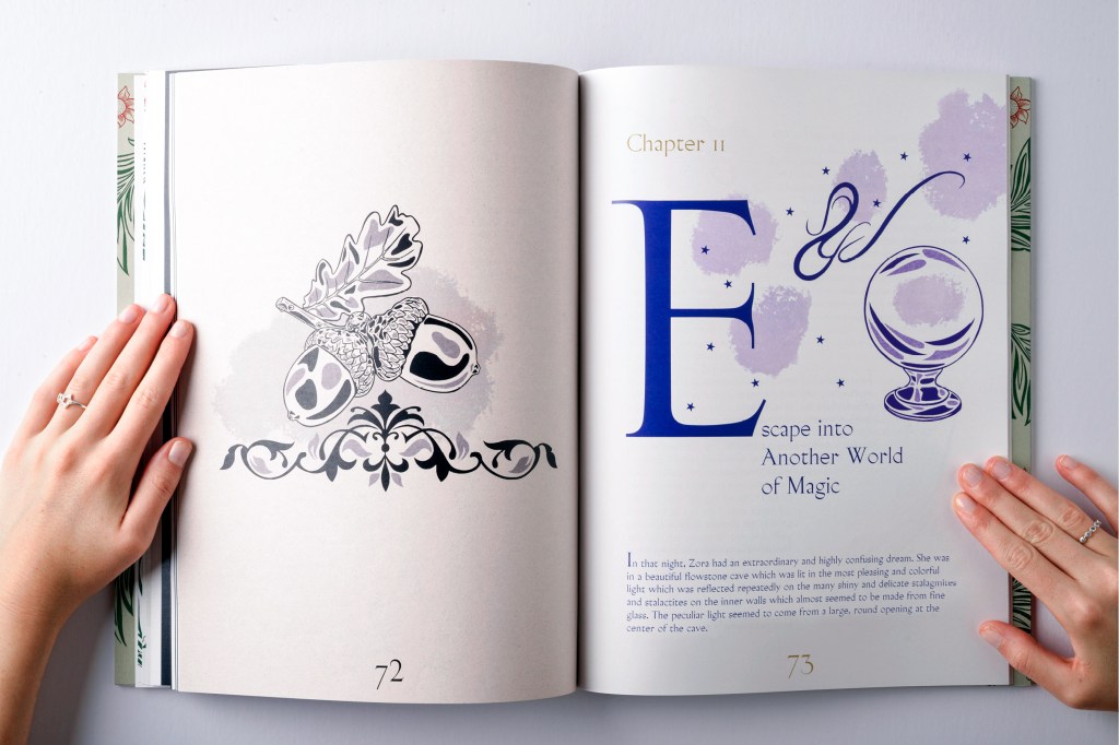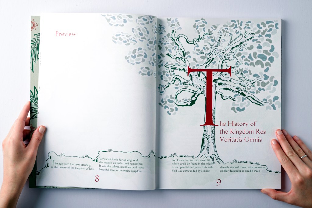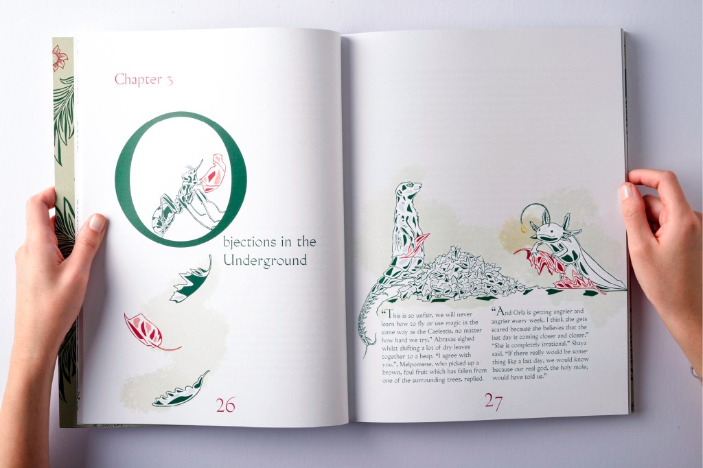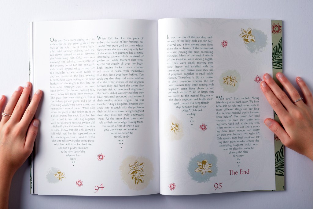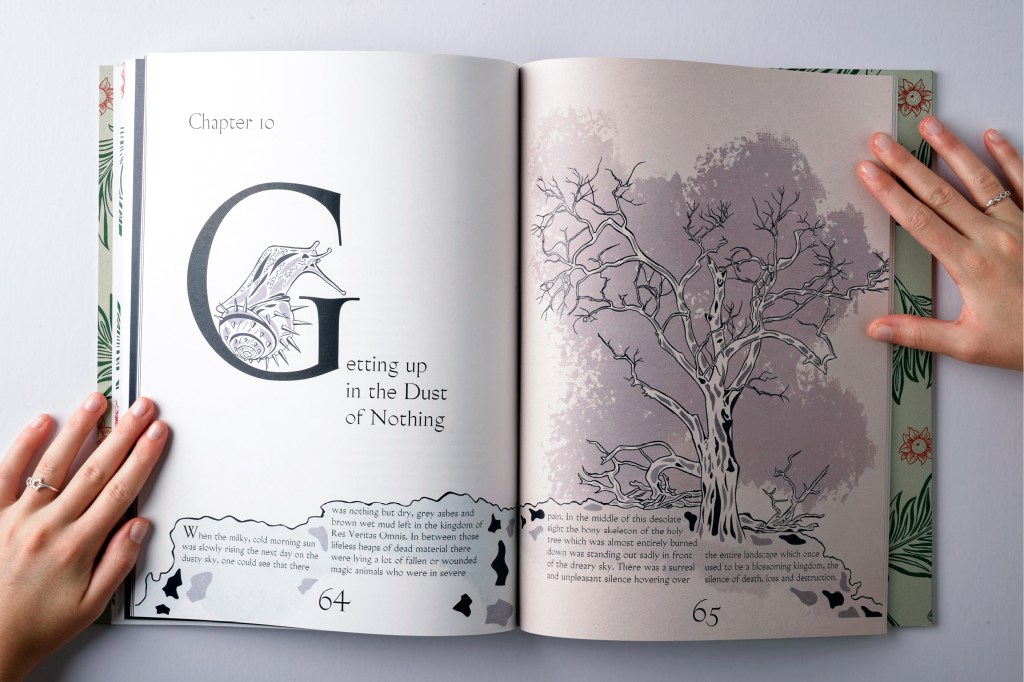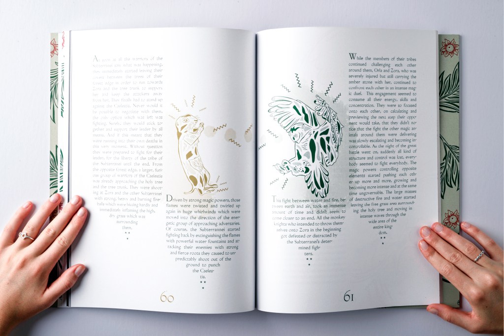 The book is printed on three differently coloured papers: daytime scenes on white, nighttime scenes on black, and post-battle scenes in the destroyed kingdom on sustainable recycled eggshell paper. This hardcover edition features an engraved front cover and decorative endpapers, giving it a refined, precious appearance.