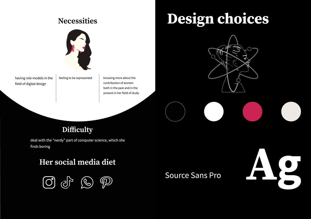 For the Interaction and Communication Design course, I collaborated with Anastasia Salvaneschi and Luisa Stegner under the supervision of Letizia Bollini. We built a prototype website for young women exploring careers in digital design that showcases practitioners in graphics, UI, and UX. An interactive quiz guides users to role models whose work matches their interests and links to personal bios and key project examples.