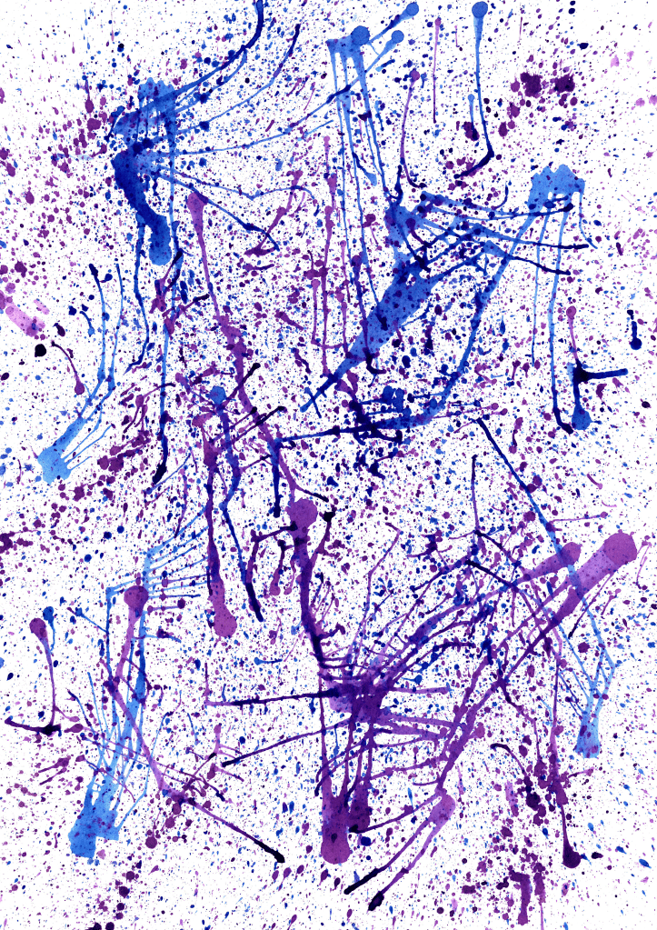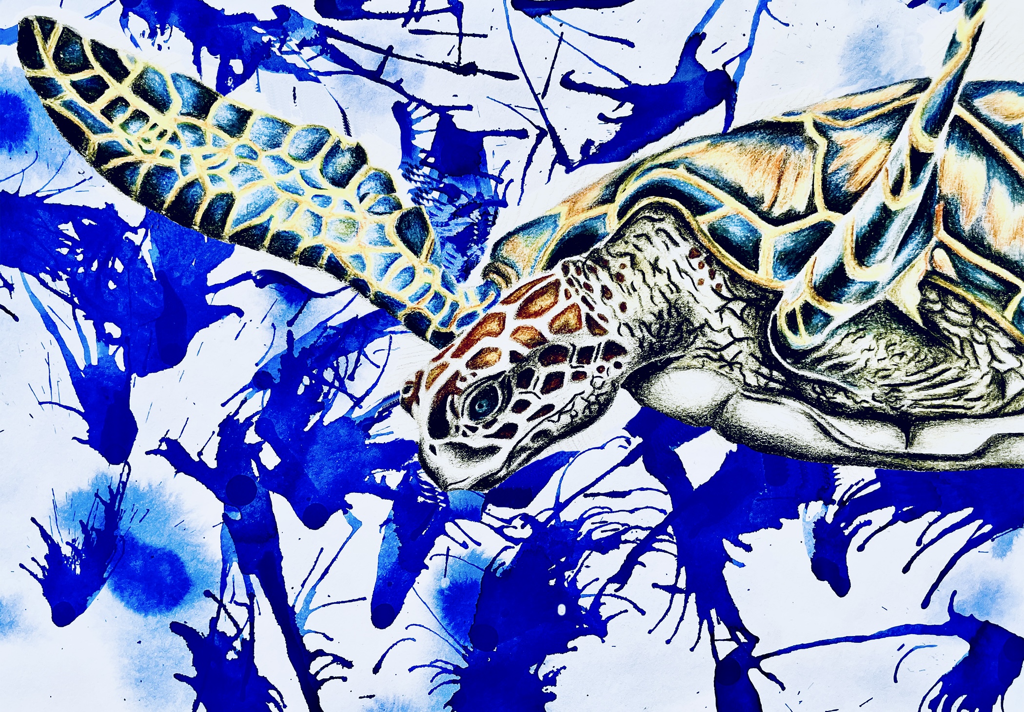 Realistic colour pencil drawing layered over a loose, expressive blue ink background.