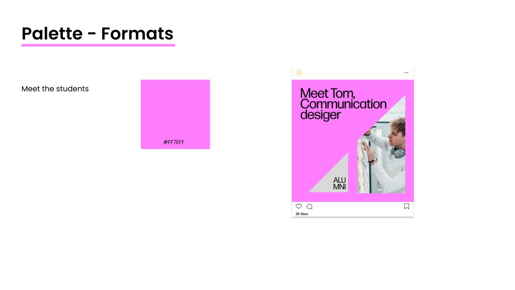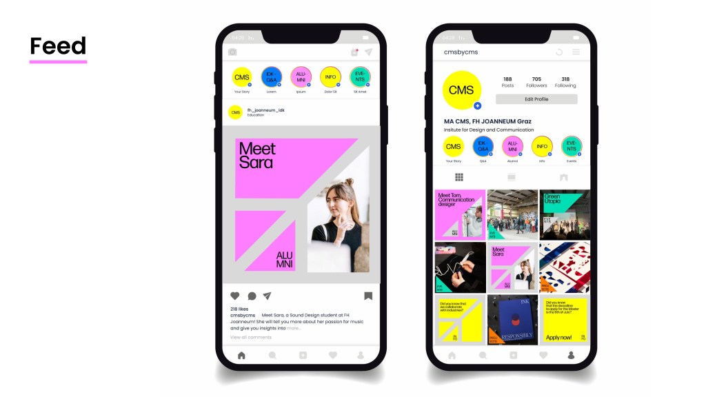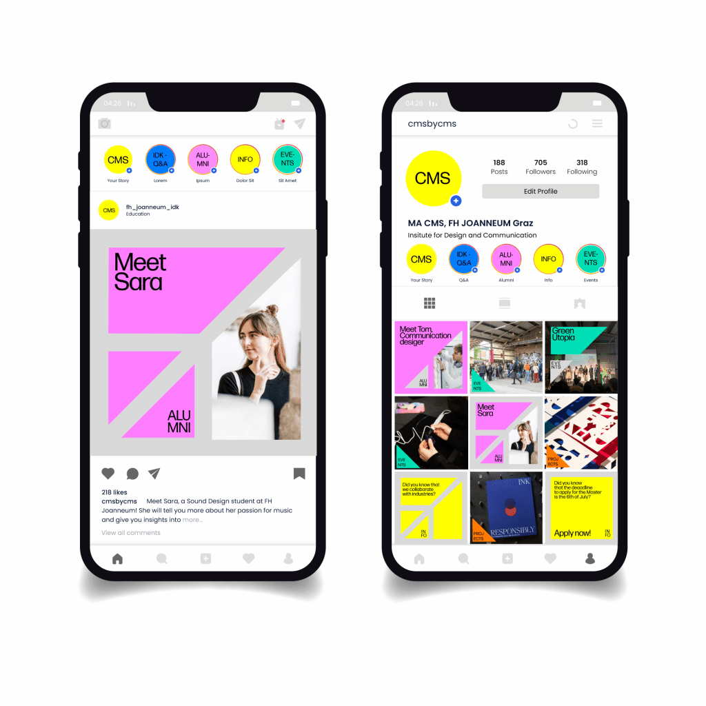 Supervised by Sara Sera during the FH Joanneum Marketing course, this project was developed in collaboration with Alice D’Aiuto and Laura Galvanetto and delivers a student-centered Instagram strategy and visual system for the Institut Design & Kommunikation. The faculty logo becomes a single geometric module that structures every post alongside Forma DJR and a palette of strong, glossy colours. At the same time, an editorial plan of student spotlights, behind-the-scenes reels, polls, and takeovers builds community, fosters relatability, and establishes industry connections.